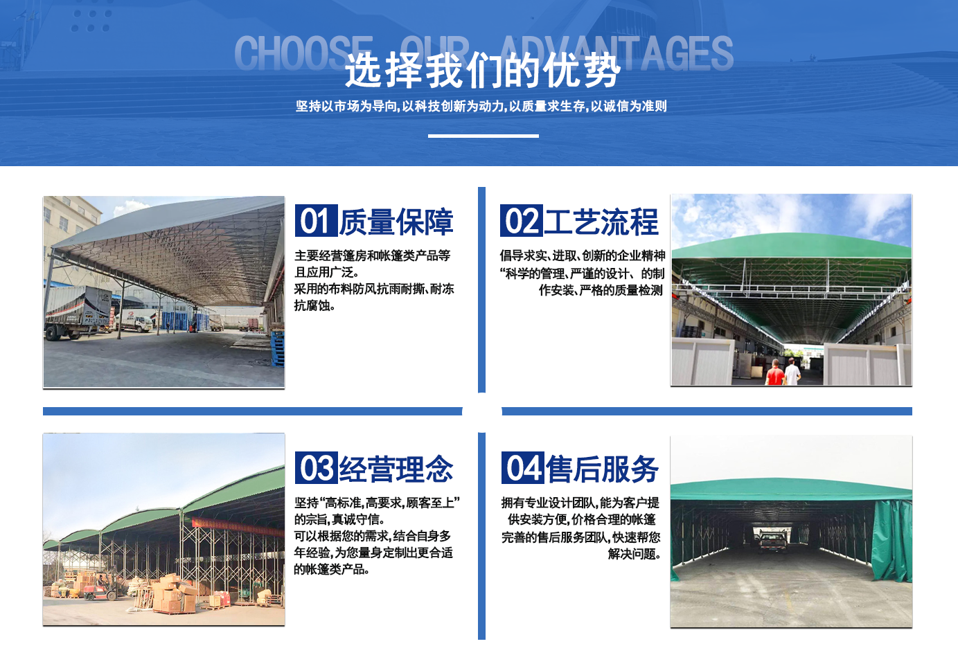 遼寧拓圖鋼結構工程有限公司是一家專業從事推拉篷設計、制作、安裝、使用、維修的綜合性公司。公司主營:電動雨棚、活動雨棚、倉庫雨棚、體育類雨棚、篷房、篷布、帳篷等系列產品的制作與安裝。 遼寧拓圖鋼結構工程有限公司堅持以市場為導向,以科技創新為動力,以質量求生存,以誠信為準則,倡導求實、進取、創新的企業精神。“科學的管理、嚴謹的設計、 的制作安裝、嚴格的質量檢測、良好的后期服務成就企業的信譽,為您提供優質服務。 遼寧拓圖鋼結構工程有限公司傾力于開發應用三維空間結構與新材料的結合,將廣告藝術視覺表現形式與張力膜材科學的結合,推出多彩推拉蓬,依靠先進的科學技術,將推拉蓬建筑表現形式無限延伸,立志走在建筑科學的前沿,引導建筑時尚潮流,我們的目標是使推拉蓬建筑在中國發展壯大。 遼寧拓圖鋼結構工程有限公司憑著極強的事業熱情和豐富的專業經驗以“勤勉進取、銳意創新、至誠至信”的精神使公司得到迅速健康發展,業務范圍遍及全國。科學的管理、嚴謹的設計、高標準的制作安裝流程,嚴格把控產品質量,熱誠的售后服務是企業競爭力的源泉。 遼寧拓圖鋼結構工程有限公司人愿以最誠摯的態度,歡迎廣大客戶的蒞臨與溝通!愿為市場提供優...